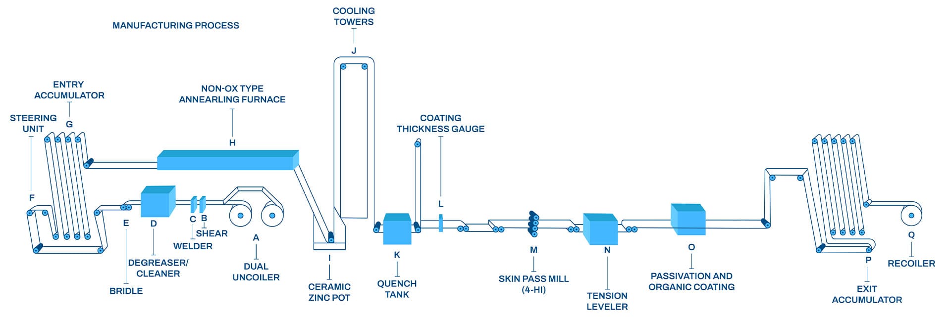 The zinc coating thickness is controlled to the highest grades of precision through an automated air-knife system and a perfect finish and flatness to the surface is achieved through a skin-pass mill and a tension leveler. Post-surface treatment in the form of chromating or application of AFP and organic coatings is done to further enhance the corrosion resistance and also provide sheen on the surface. The whole process is computer aided to help achieve higher levels of uniformity and perfection.